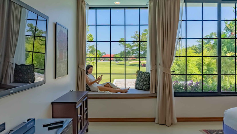 Situated on the upper level, this master bedroom also overlooks the golf course. It includes a king-size bed, 65” smart TV, luxury armchair, bay window, ceiling fan, air-conditioning, safety deposit box, and an ensuite bathroom with a bathtub, rain shower, double vanities, and separate toilet.