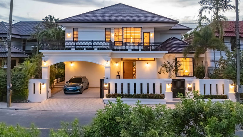The formal dining area of the villa is a contemporary air-conditioned high vaulted ceiling in a courtyard look, overlooking the large Patio & sparkling blue pool area. A large Italian dining table is the center of spotlight, surrounded by twelve comfortable chairs for intimate gatherings. Three exquisite crystal chandeliers cast a warm glow over the space, adding atouch of elegance. Guests can indulge in delicious meals while enjoying the serene ambiance.