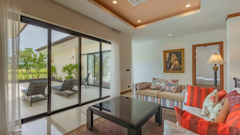 Villa Viola’s warm and luxurious poolside area epitomizes a tropical villa holiday. Unwind after a long day on the poolside sunbeds and soak in the panoramic views of the bright blue sky over the undulating golf course or continue to laze and witness stunning sunset with sky turning with hues of red and yellow. With a15-meter swimming pool surrounded by lush greenery, it’s an idyllic spot to enjoy the serene ambiance. Behind the pool lies an outdoor gazebo/Sala that provides a charming spot for morning tea or coffee, and a dedicated gazebo bar for sunset drinks,. The open-air sala is perfect for al fresco dining under a blanket of stars, creating unforgettable evenings.